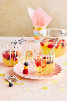 Ein Highlight auf jedem Kindergeburtstag ist eine bunte Beeren-Bowle. Valensina KIDS Apfel Zitrone (mit den Schlümpfen auf der Flasche) ist gemischt mit frischem Pfefferminztee die perfekte Basis dafür. Einfach zusammen mit Erdbeeren, Heidelbeeren, Himbeeren und Melone in eine große Schüssel geben, mit etwas Holunderblütensirup verfeinern und fertig. Wenig Arbeit für viel Begeisterung bei den Kids.