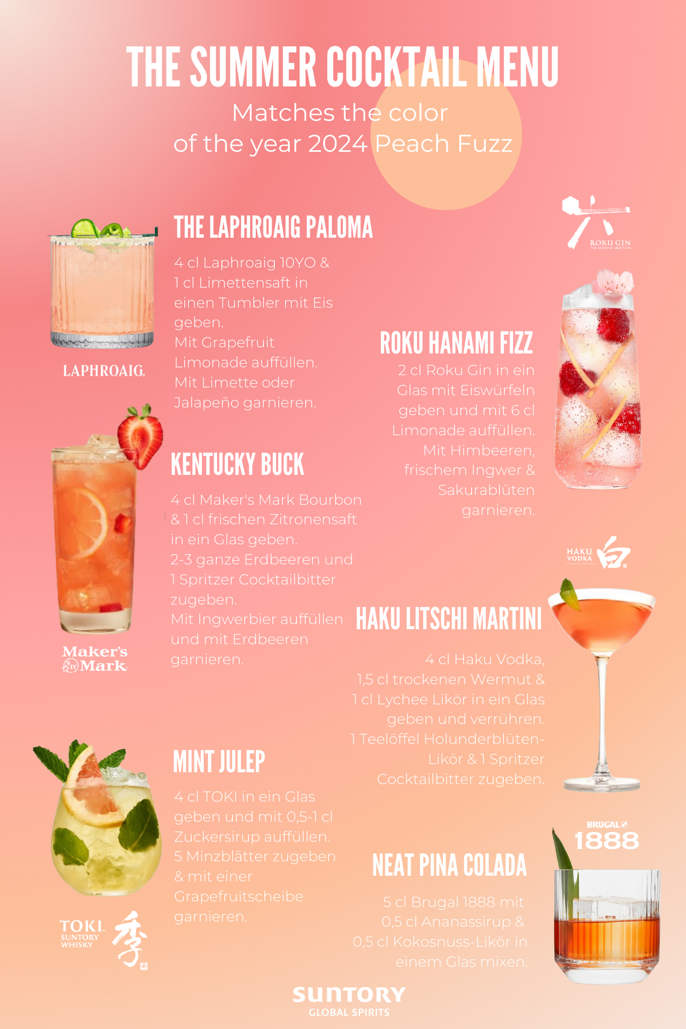 Passend zu Farbe des Jahres Peach Fuzz gibt es einen Drink, der dieser Farbe erstaunlich nah kommt: den Laphroaig Paloma! Weitere ausgewählte Drinks folgen hier, um sie direkt zu Hause auszuprobieren. Cheers!