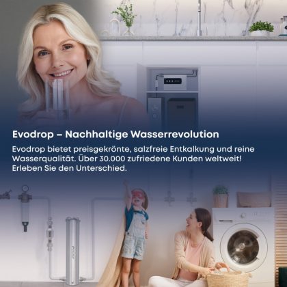 Die Evodrop AG präsentiert eine neuartige Anlage zur Entkalkung von Trinkwasser. Das System arbeitet mit Apfelsäuregranulat-Kartuschen, die Leitungswasser filtern. Es verzichtet auf die in herkömmlichen Anlagen verwendeten umweltschädlichen Salze und verursacht keine Strom- und Abwasserkosten. Zudem filtert es nicht nur Kalk, sondern auch Schwermetalle, Bakterien, Viren, Mikroplastik und Pestizide. Das System leistet somit einen erheblichen Beitrag zur Gesundheit sowie zur Schonung von Umwelt, Wasserleitungen und Haushaltsgeräten.