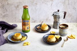 Das Wort „Flan“ stammt aus dem Französischen und bezeichnet eine köstliche Süßspeise. Ursprünglich hat es seinen Ursprung jedoch im antiken Rom. Die Römer bereiteten eine süße Speise namens „flado“ zu, die aus Milch, Eiern und Honig bestand. Im Laufe der Zeit wurde dieses Rezept von verschiedenen Kulturen übernommen und angepasst. Heutzutage ist Flan in vielen Ländern der Welt beliebt und wird oft in verschiedenen Varianten zubereitet. Eine besonders raffinierte Version des beliebten Desserts präsentiert HITCHCOCK. Ein fruchtiger Kokos-Flan, überzogen mit einem goldglänzenden Kurkuma-Karamell, vereint exotische Süße mit einer würzigen Note. Verantwortlich für den Twist ist der Ingwer Shot Orange Kurkuma aus der Shot Collection von HITCHCOCK. Dank der erfrischenden Zitrusnote und der feinen Schärfe des Ingwers schmeckt der Kokos-Flan herrlich erfrischend und leicht würzig.