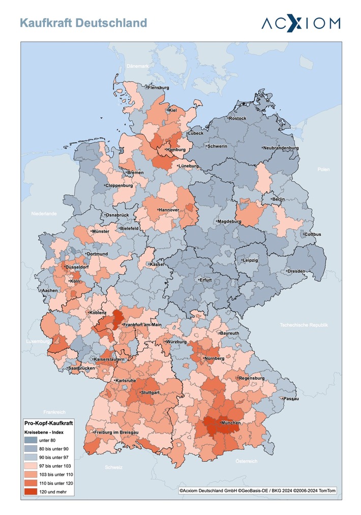 Das Customer Intelligence Unternehmen Acxiom analysiert für Kunden aus unterschiedlichen Branchen, darunter Automotive, Finanzdienstleistungen, Healthcare, Pharma, Telekommunikation, Tourismus, Einzelhandel sowie Technologie & Consumer Electronics, jährlich die regionalisierte Kaufkraft.
