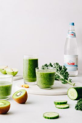 1. Zunächst die krausen Blätter des Grünkohls von den Stielen und harten Blattrippen befreien und gründlich waschen. Gurke und Apfel ebenfalls gründlich waschen. Dann den Apfel entkernen und Apfel und Gurke in grobe Stücke schneiden. Ingwer und Kiwi schälen und jetzt zusammen mit Grünkohl, Gurke und Apfel pürieren.