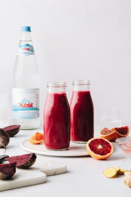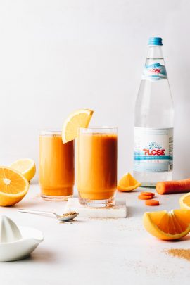 2. Blutorangen auspressen und den Saft zusammen mit Plose Mineralwasser Naturale und Leinöl unter die übrigen Zutaten mixen. Falls der Smoothie noch zu dickflüssig ist, kann noch etwas mehr Plose Mineralwasser Naturale hinzugefügt werden. Zum Schluss den Smoothie auf zwei Gläser verteilen.