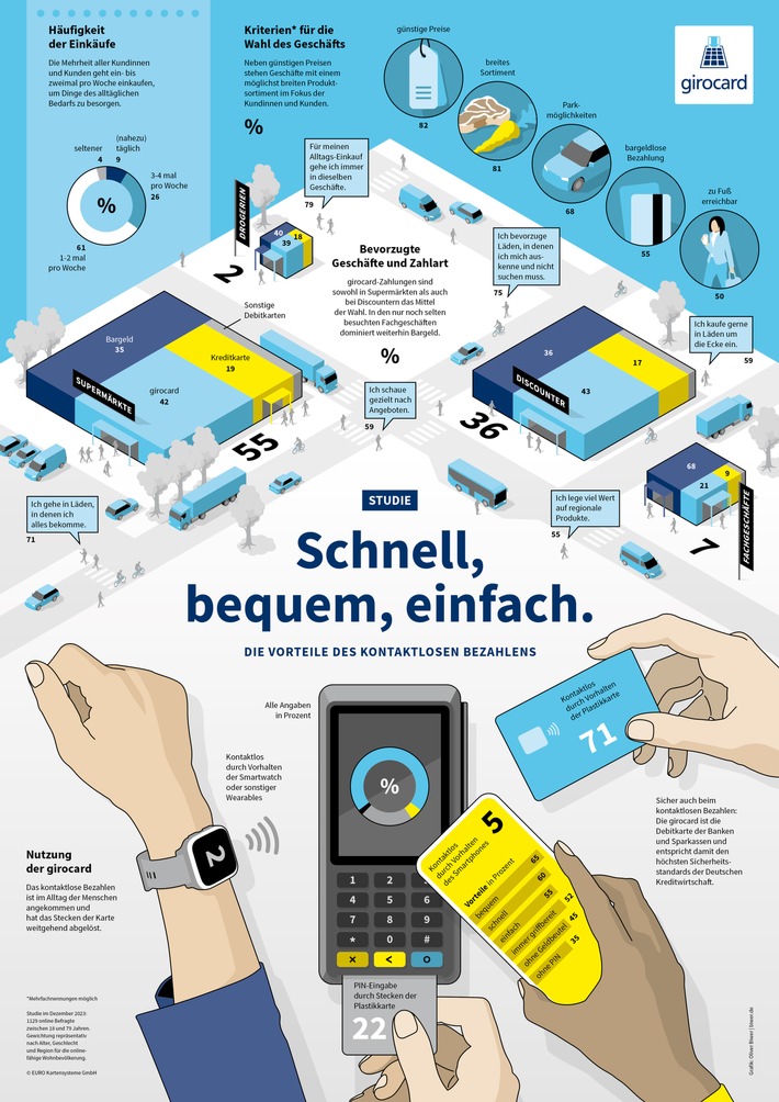 Ob im Supermarkt, beim Discounter oder in der Drogerie – mit einem kurzen „Bing“ wird der Bezahlvorgang in wenigen Sekunden abgeschlossen, ohne Münzen zu suchen oder eine PIN einzugeben. Die girocard spielt dabei eine zentrale Rolle und hat sich als feste Größe in den Bezahlalltag etabliert. Wie oft der Gang in den Supermarkt stattfindet oder nach welchen Kriterien die Auswahl der Einkaufsstätten erfolgt, zeigt eine Studie von infas quo im Auftrag der EURO Kartensysteme. Beim Bezahlen ist klar: Bequem, schnell und einfach muss es gehen.