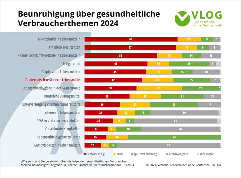 Eine deutliche Mehrheit der Verbraucher:innen ist beunruhigt über den Einsatz von Gentechnik in der Lebensmittelproduktion. Das geht aus den Ergebnissen des BfR-Verbrauchermonitors 02/2024 zu „gesundheitlichen Verbraucherthemen“ hervor. Auf die Frage wie sehr sie persönlich beunruhigt sind, gaben 42 Prozent von 1.000 Befragten an, „sehr beunruhigt“ über Gentechnik im Essen zu sein, 23 Prozent waren „mittel beunruhigt“. Im Laufe der vergangenen sieben Befragungen zum halbjährlich veröffentlichten BfR-Monitor blieben diese Werte konstant hoch und schwankten nur leicht. Mit 93 Prozent liegt Gentechnik aktuell bei der „Bekanntheit von gesundheitlichen Verbraucherthemen“, nur knapp hinter Mikroplastik und E-Zigaretten an dritter Stelle, vor Antibiotikaresistenzen und Resten von Pflanzenschutzmitteln.