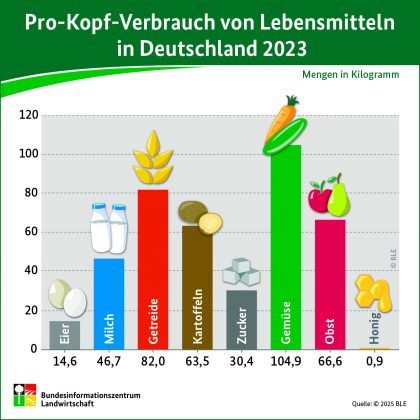 Besonders stark angestiegen ist 2023 der rechnerische Pro-Kopf-Verbrauch von Kartoffeln: er lag bei 63,5 Kilogramm (+ 14 Prozent). Umgekehrt war bei Zucker ein Rückgang um zehn Prozent gegenüber 2022 zu verzeichnen.