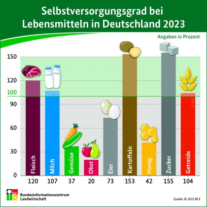 Das ist letztlich aber nur ein rechnerischer Durchschnittswert. Betrachtet man einzelne Erzeugnisse, zeigt sich eine enorme Bandbreite: Während Obst und Gemüse zum überwiegenden Teil importiert werden müssen, erzeugt die deutsche Landwirtschaft deutlich mehr Zucker oder Kartoffeln als zur Nachfragedeckung in Deutschland erforderlich wäre. Im Vergleich zum Vorjahr blieben die Werte 2023 weitgehend konstant. Lediglich bei Zucker stieg der Selbstversorgungsgrad deutlich an: um fast ein Sechstel auf 155 Prozent.