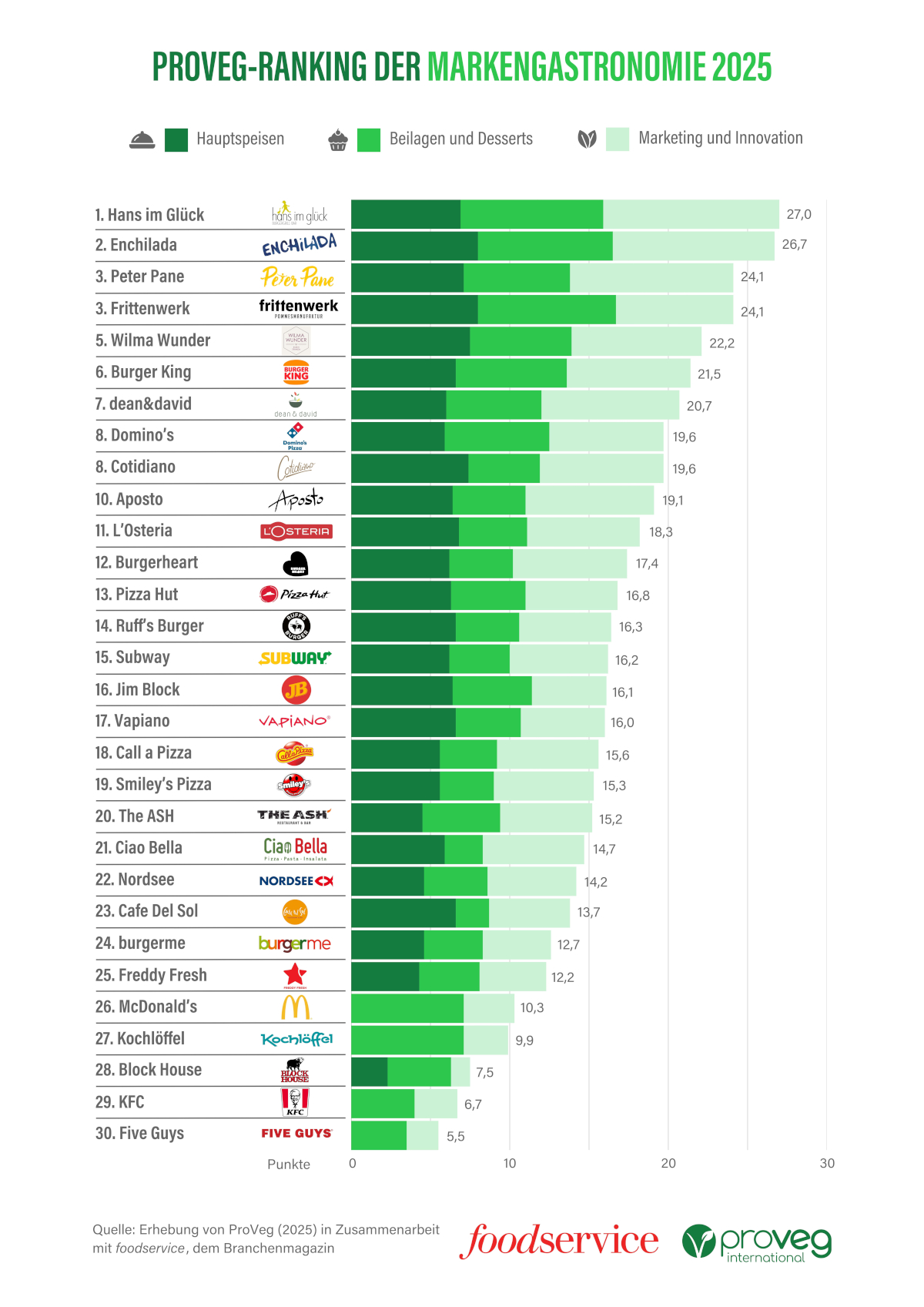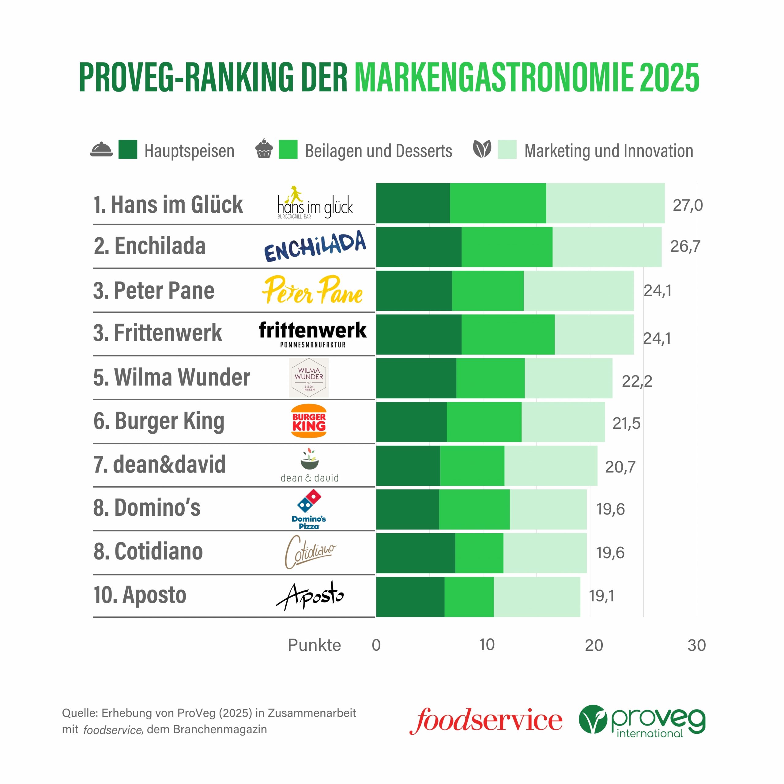 Im aktuellen ProVeg-Ranking der Markengastronomie ist Hans im Glück wieder an die Spitze zurückgekehrt, der Newcomer Frittenwerk hat es unter die Top 3 geschafft. Branchenweit baut die Markengastronomie ihr pflanzliches Angebot spürbar aus: mit mehr Fleisch- und Fischalternativen als je zuvor, veganen Saucen und Teigwaren nach dem Prinzip „eine Rezeptur für alle“ und immer häufiger zu günstigeren Preisen als tierische Gerichte. Auch Delikatessen, die für Luxus stehen, finden zunehmend den Weg auf die Teller.