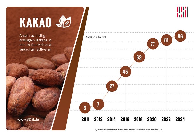 Der Bundesverband der Deutschen Süßwarenindustrie e.V. (BDSI) teilt mit, dass der Anteil des nach Nachhaltigkeitskriterien erzeugten Kakaos in den in Deutschland verkauften Süßwaren im Jahr 2024 auf 86 % gestiegen ist.