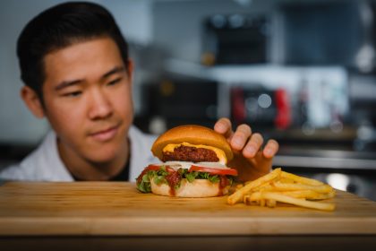 Die am Fraunhofer IVV entwickelten veganen Fleischalternativen kombinieren unterschiedliche Proteinquellen wie Erbsen und Pilze. Das Resultat sind besonders saftige Burgerpatties mit verbessertem Nährwertprofil. © Fraunhofer IVV