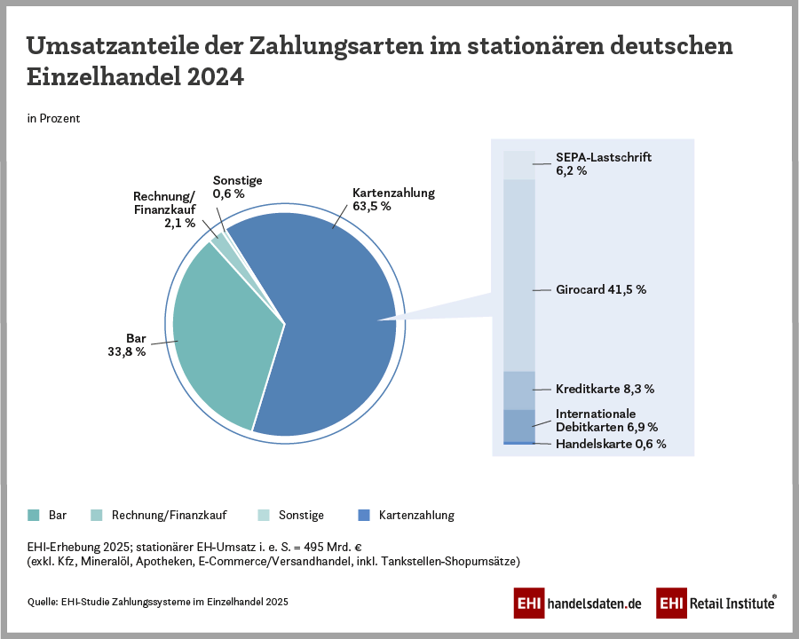 Innerhalb der Kartenzahlungen bleibt die Girocard – trotz eines Rückgangs von 0,9 Prozentpunkten – mit 41,5 Prozent Marktführer im stationären Einzelhandel. Internationale Debitkarten (Visa Debit, Debit Mastercard) verzeichnen ein signifikant starkes Wachstum von 2,8 Prozentpunkten auf nun 6,9 Prozent Umsatzanteil; Kreditkarten müssen ein leichtes Minus von 0,3 Prozentpunkten hinnehmen und landen bei 8,3 Prozent. Sepa-Lastschrift bringt es auf 6,2 Prozent.