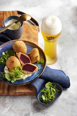 Food-Pairing-Tipp: Serviert wird die Rote Bete im Bierteig mit einem Weihenstephaner Hefeweißbier.
