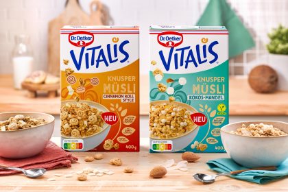 Dr. Oetker ergänzt sein Vitalis-Sortiment mit dem Knusper Müsli Cinnamon Roll Style und dem Knusper Müsli Kokos-Mandel um zwei leckere Sorten.