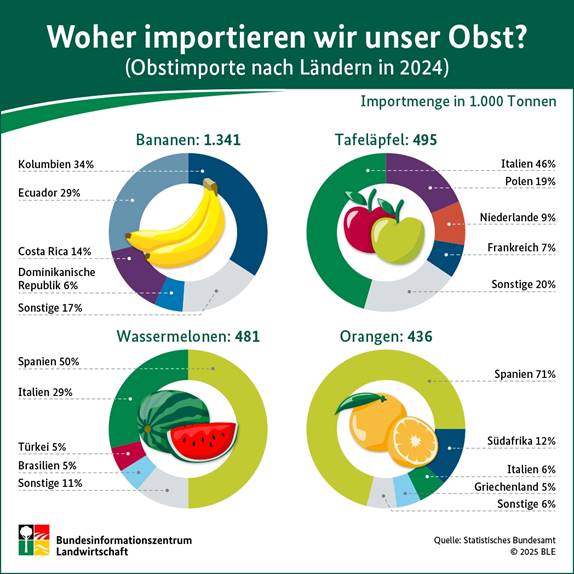 Bei der Herkunft zeigen sich deutliche Schwerpunkte: Während Äpfel, Melonen und Orangen meist aus Spanien oder Italien kommen, werden Bananen vor allem aus Süd- und Mittelamerika importiert.