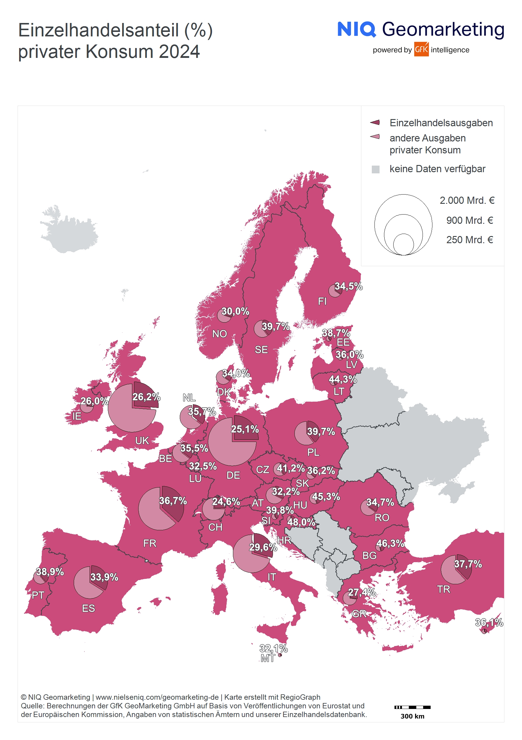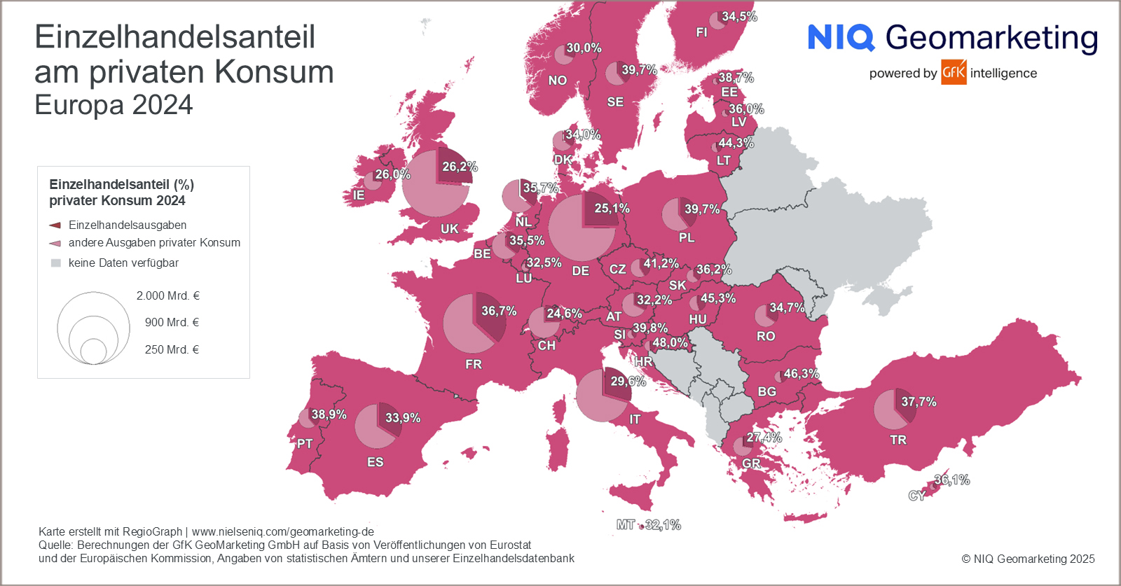 Das Geomarketing Bild des Monats für August zeigt den Einzelhandelsanteil am privaten Konsum 2024 in 31 europäischen Ländern.