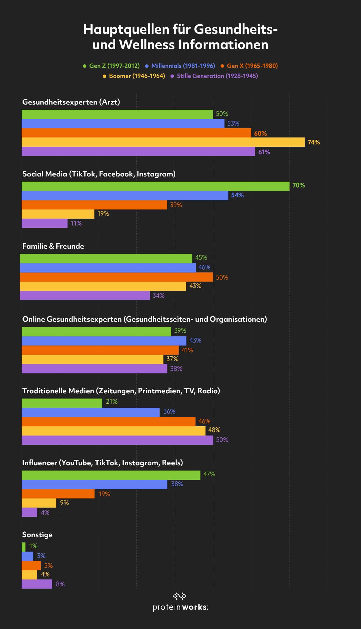 Wo wir Informationen zur Gesundheit erhalten, beeinflusst, was wir letztendlich als gesund einstufen.  Für Generation Z ist das zu 69,50 % Social Media, der höchste Wert über alle Generationen hinweg. Für die Babyboomer (60–74 Jahre alt) sind Gesundheitsexpert*Innen mit 74,79 % die Nummer 1 Quelle.