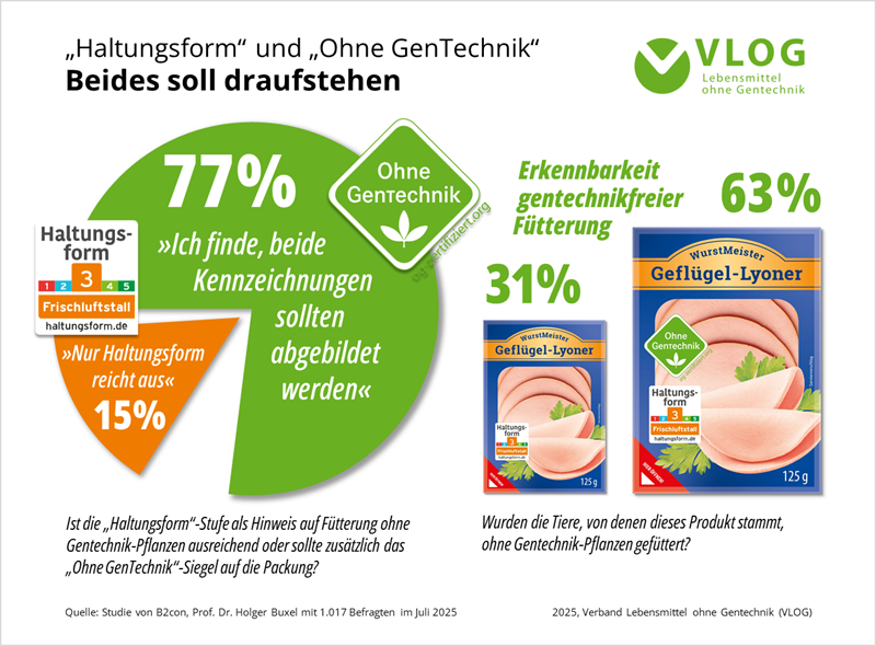 Prof. Dr. Holger Buxel von der FH Münster hat im Auftrag des VLOG 1.017 Personen in einer quotierten Online-Befragung im Juli 2025 einen umfangreichen Fragenkatalog vorgelegt. 76 Prozent der Befragten halten das „Ohne GenTechnik“-Siegel demnach für nützlich, 66 Prozent hilft es die richtigen Produkte für sich auszuwählen. 76 Prozent sind der Meinung, dass Produkte mit gentechnikfreier Fütterung mit dem „Ohne GenTechnik“-Siegel ausgezeichnet werden sollten.