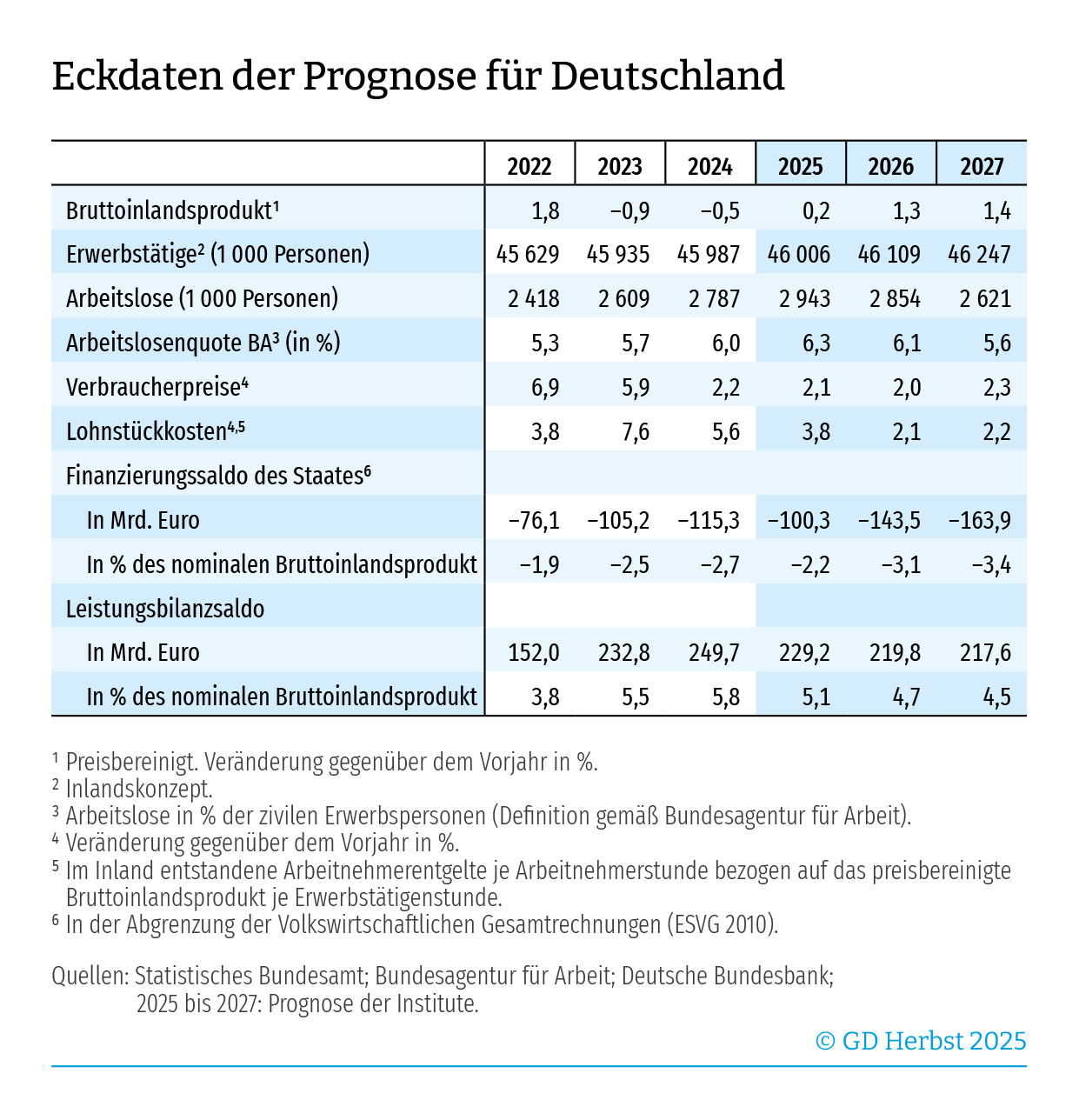 Die Gemeinschaftsdiagnose wird zweimal im Jahr im Auftrag des Bundesminis­teriums für Wirtschaft und Energie erstellt. Am Herbstgutachten 2025 haben mit­gewirkt: