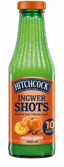Ingwer-Shots sind besonders im Winter ein beliebter Booster fürs Immunsystem und ein energetisches Lebensgefühl. Die HITCHCOCK Ingwer-Shots in der großen grünen 0,5-l-Flasche sind Vitamin-C-reich und ergeben bis zu zehn Portionen. Das spart Verpackung und schont die Umwelt. Die Shots sind in den Sorten Orange-Kurkuma, Grapefruit-Limette, Maracuja-Acerola sowie ab September 2025 auch Himbeere erhältlich. Von September 2025 bis März 2026 gibt es außerdem die Limited Edition Kürbis-Zimt, die vor allem Fans des Pumpkin-Spice-Trends begeistern dürfte. Aber auch, wer gerne einmal neue Geschmacksrichtungen testet und Wintergewürze mag, sollte den Ingwer-Shot Kürbis-Zimt unbedingt ausprobieren.