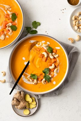 Da das Vata-Dosha von Kälte, Leichtigkeit und Trockenheit geprägt ist, bieten warme, nahrhafte und feuchtigkeitsspendende Speisen wie dieses cremige Süppchen den idealen Ausgleich. Die gelungene Mischung aus Süßkartoffel (wärmend und erdend), Kokosmilch (beruhigend und feuchtigkeitsspendend), Kreuzkümmel (unterstützt die Verdauung), Zimt (wärmend und beruhigend) und gerösteten Cashewkernen (nahrhaft und stabilisierend) eignet sich perfekt für den Vata-Typ. Bei cremigen Suppen führt ein Schuss Mineralwasser kurz vor dem Servieren zu einem Maximum an Cremigkeit.