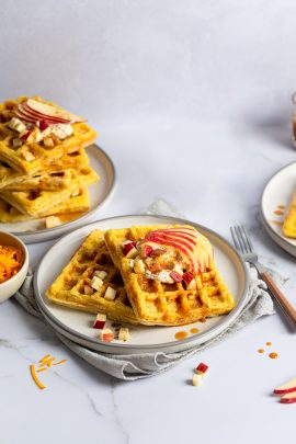 Einen wahren Herbstgenuss bieten diese knusprigen Kürbis-Waffeln mit ihrer feinen Nussnote und dem Topping aus saftigen Apfelstücken und cremiger Karamellsauce. Die sprudelnde Leichtigkeit des Mineralwassers macht die Waffeln zudem schön locker und fluffig, während der Naturjoghurt für die perfekte Frische sorgt. Ob als Frühstück, Dessert oder süße Auszeit – diese Waffeln sind einfach unwiderstehlich.