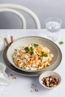 Butternut-Kürbis sorgt mit seinem mild-süßlichen, leicht nussigen Geschmack und einer feinen, buttrigen Note für die perfekte Base dieser cremigen Sauce. Der säuerliche, würzige Ziegenkäse bringt einen gewissen Kontrast mit rein und abgerundet wird das Ganze durch die süße Birne, die gerösteten Haselnüsse sowie einen Hauch Parmesan. Das Mineralwasser sorgt für eine leichte, geschmeidige Konsistenz, während Knoblauch, Schalotte und Petersilie den perfekten aromatischen Feinschliff geben.