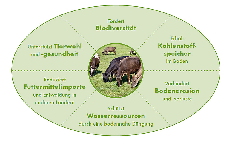 Dauergrünland speichert bei sorgsamer Bewirtschaftung Kohlenstoff und kann so zur Klimaschutzfläche werden. In der Schweiz machen Wiesen und Weiden rund 70 % der landwirtschaftlichen Nutzfläche aus. Viele dieser Flächen sind für den Ackerbau ungeeignet, bieten aber eine wertvolle Basis für die nachhaltige Produktion von Milch und Fleisch.