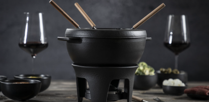 Warmes Eichenholz und edles schwarzes Gusseisen – eine Liaison aus Materialien mit Charakter. Das Caquelon verleiht dem Tisch einen modernen Industrial-Look, während die gleichmäßige Wärmeverteilung dafür sorgt, dass das Käse- oder Fleischfondue besonders cremig und genussvoll bleibt. Der praktische Gegengriff des Caquelons macht das Handling angenehm und sicher. Rechaud, Caquelon und Gabeln sind optisch aufeinander abgestimmt. Designt wurden die zeitlos schlichten Sets in der Schweiz – für ein elegantes Fonduevergnügen.