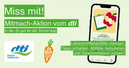 Vom 29. September, dem Internationalen Tag gegen Lebensmittelverschwendung, bis zum 6. Oktober 2025 findet zum sechsten Mal die jährliche Aktionswoche „Zu gut für die Tonne!“ des BMLEH statt. Mit einem digitalen Küchentagebuch in der kostenfreien „Zu gut für die Tonne!“-App können Verbraucher ihre Lebensmittelabfälle erfassen, Belohnungen sammeln und nebenbei wertvolle Tipps gegen Lebensmittelverschwendung erhalten. Das Küchentagebuch wurde im Rahmen des Projekts „Dialogforum private Haushalte 2.0“ von Slow Food Deutschland e. V. und der Technischen Universität Berlin (TU Berlin) gemeinsam mit dem BMLEH entwickelt. Das dti unterstützt die Aktion „Miss mit!“ als Partner.