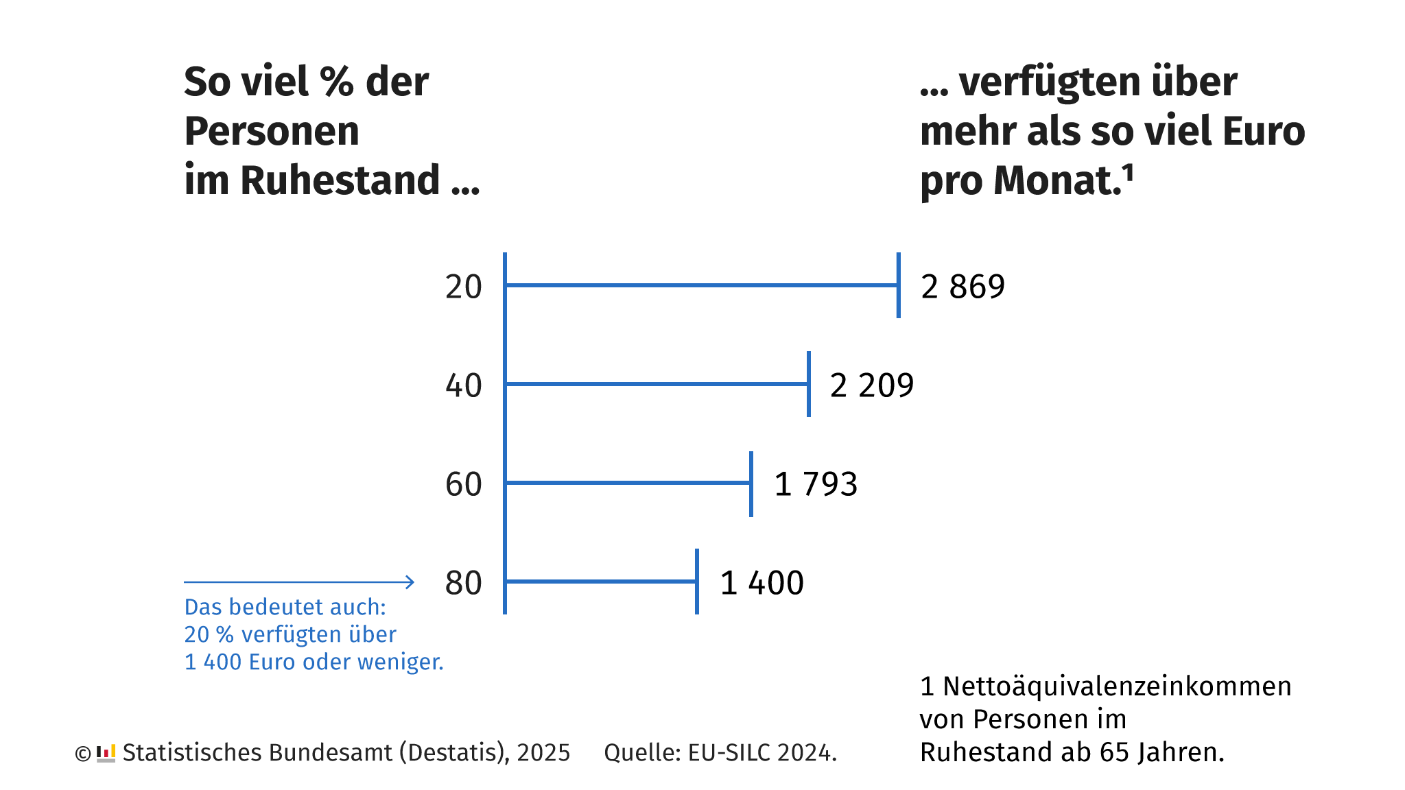 Jede fünfte Person (20 %) im Ruhestand ab 65 Jahren hat ein monatliches Nettoäquivalenzeinkommen von maximal 1 400 Euro zur Verfügung. Weitere 20 % verfügen über mehr als 1 400 Euro, aber weniger als rund 1 790 Euro im Monat, wie das Statistische Bundesamt (Destatis) nach Ergebnissen der Erhebung zu Einkommen und Lebensbedingungen (EU-SILC) 2024 mitteilt. Die 20 % der Personen im Ruhestand mit dem höchsten Einkommen hatten monatlich mehr als rund 2 870 Euro netto zur Verfügung. Betrachtet wurden Rentnerinnen und Rentner sowie Pensionäre und Pensionärinnen im Alter von mindestens 65 Jahren – das waren zuletzt 16,3 Millionen Menschen. Das Nettoäquivalenzeinkommen ist ein bedarfsgewichtetes Pro-Kopf-Einkommen, das das Einkommen von Personen vergleichbar macht, die in unterschiedlich zusammengesetzten Haushalten leben.