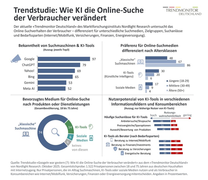 Dies zeigt die aktuelle Ausgabe des „Trendmonitor Deutschland“ des Marktforschungsinstituts Nordlight Research zum Thema: „Googeln war gestern (?): Wie KI die Online-Suche der Verbraucher verändert“. Für die Trendstudie wurden über 1.500 Bundesbürgerinnen und Bundesbürger zwischen 18 und 75 Jahren befragt, die im Alltag Suchmaschinen, KI-Tools oder soziale Medien nutzen und in den Konsumbereichen Internet/Mobilfunk, Versicherungen, Finanzen oder Energieversorgung als Verbraucher mitentscheiden. Im Fokus standen das aktuelle und zukünftige Online-Suchverhalten, unterschiedliche Suchmedien, zentrale Informationsfelder sowie generelle Einstellungen zu Künstlicher Intelligenz.