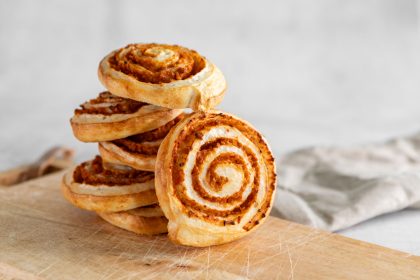 Blätterteig liefert hauchdünne Schichten, außen knusprig und innen soft. Als herzhafte Snacks werden vor allem Stangen und Taschen angeboten, z. B. mit Spinat-Feta-Füllung, Käse-Schinken oder mediterranem Gemüse.