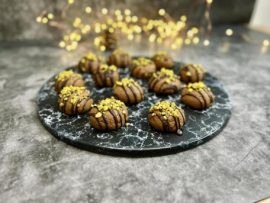 Dekor: Die Kuvertüre nach Herstellerangabe schmelzen. Die Nougat-Küsschen damit nach Belieben verzieren und mit gehackten Pistazien bestreuen.
