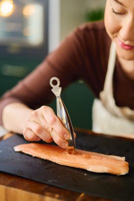 Viktorias Tipp: „Guter Fisch lebt von der Textur – da darf nichts den zarten Genuss stören. Mit der RÖSLE Zange erwische ich jede Gräte, ohne das Filet zu zerdrücken. Die Zange liegt leicht, aber stabil in der Hand. Das ist genau der Unterschied, auf den es ankommt, wenn man auch mal mehrere Portionen vorbereiten muss.“