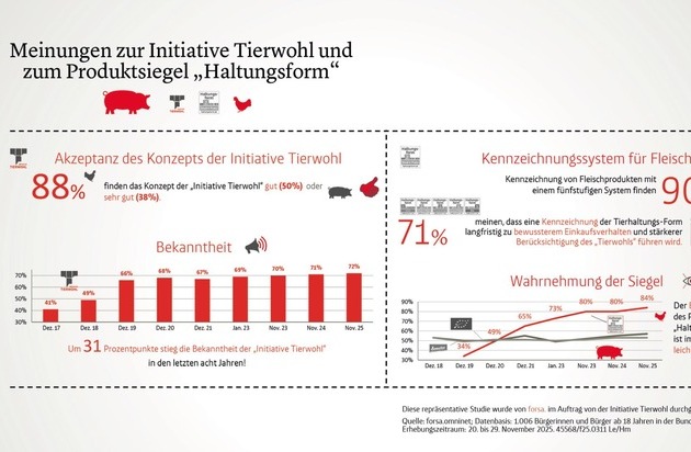 Im Auftrag der Initiative Tierwohl GmbH hat forsa Gesellschaft für Sozialforschung und statistische Analysen GmbH wiederholt eine Befragung zur Haltung von Nutztieren in Deutschland und zu Tierwohl-Siegeln durchgeführt. Im Rahmen der aktuellen Untersuchung wurden insgesamt 1.006 nach einem systematischen Zufallsverfahren ausgewählte Bürgerinnen und Bürger ab 18 Jahren in der Bundesrepublik Deutschland befragt. Die Erhebung wurde vom 20. bis 28. November 2025 mithilfe des Befragungspanels forsa.omninet durchgeführt. Die ermittelten Ergebnisse können mit den bei allen Stichprobenerhebungen möglichen Fehlertoleranzen (im vorliegenden Fall +/- 3 Prozentpunkte) auf die Gesamtheit der Bevölkerung ab 18 Jahren in Deutschland übertragen werden.