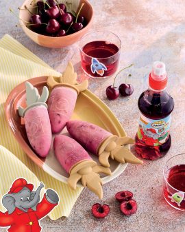 Zutaten für 9 – 10 Eis am Stiel: 250 g Kirschen 300 g Joghurt 80 g Agavendicksaft 200 ml Valensina KIDS „Roter Fruchtmix“ Benjamin Blümchen optional: weiße Schokolade außerdem: Eisformen und Eisstiele |