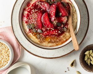 Zutaten für zwei Portionen: 2 getrocknete Aprikosen 120 g Hirseflocken 1 TL Kokosöl 500 ml Plose Mineralwasser Naturale 200 ml Reisdrink ½ TL gemahlenes Kardamom-Gewürz …