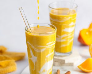Zutaten für zwei Portionen: 300 g Hokkaido-Kürbis 330 ml Plose Mineralwasser Naturale 1 Banane 1 Orange 150 g Naturjoghurt 1 EL Mandelmus 0,5 EL Honig …