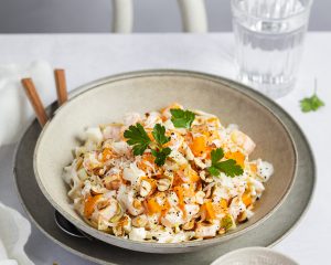 Zutaten für zwei bis drei Portionen: 350 g Butternutkürbis 1 Schalotte 1 Knoblauchzehe 1 EL Butter 300 ml Plose Mineralwasser Naturale 250 g Spaghetti 1 …