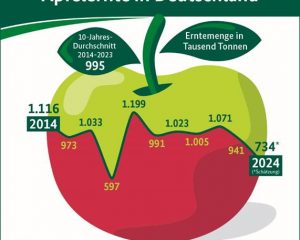 Die Apfelanbaubetriebe in Deutschland rechnen für 2024 mit einer Apfelernte von rund 734.000 Tonnen. Gegenüber dem Vorjahr wäre dies ein Rückgang um rund 22 Prozent, …