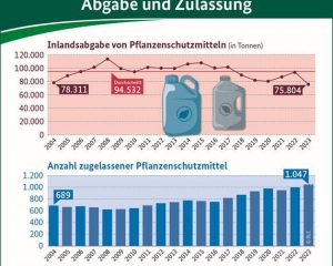 Die Menge* der in Deutschland abgegebenen Pflanzenschutzmittel ist 2023 gegenüber dem Vorjahr deutlich zurückgegangen: um 19 Prozent auf 75.804 Tonnen. Das ist der niedrigste Wert …