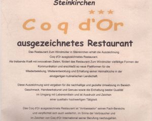 WeiterlesenRestaurant zum Windmüller Steinkirchen zum Coq d‘Or ausgezeichneten Restaurant ernannt