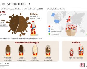 Die deutsche Süßwarenindustrie hat in diesem Jahr für die Weihnachtszeit rund 146 Millionen Schokoladen-Nikoläuse und -Weihnachtsmänner hergestellt. Gegenüber dem Vorjahr mit seinen 164 Millionen bedeutet …